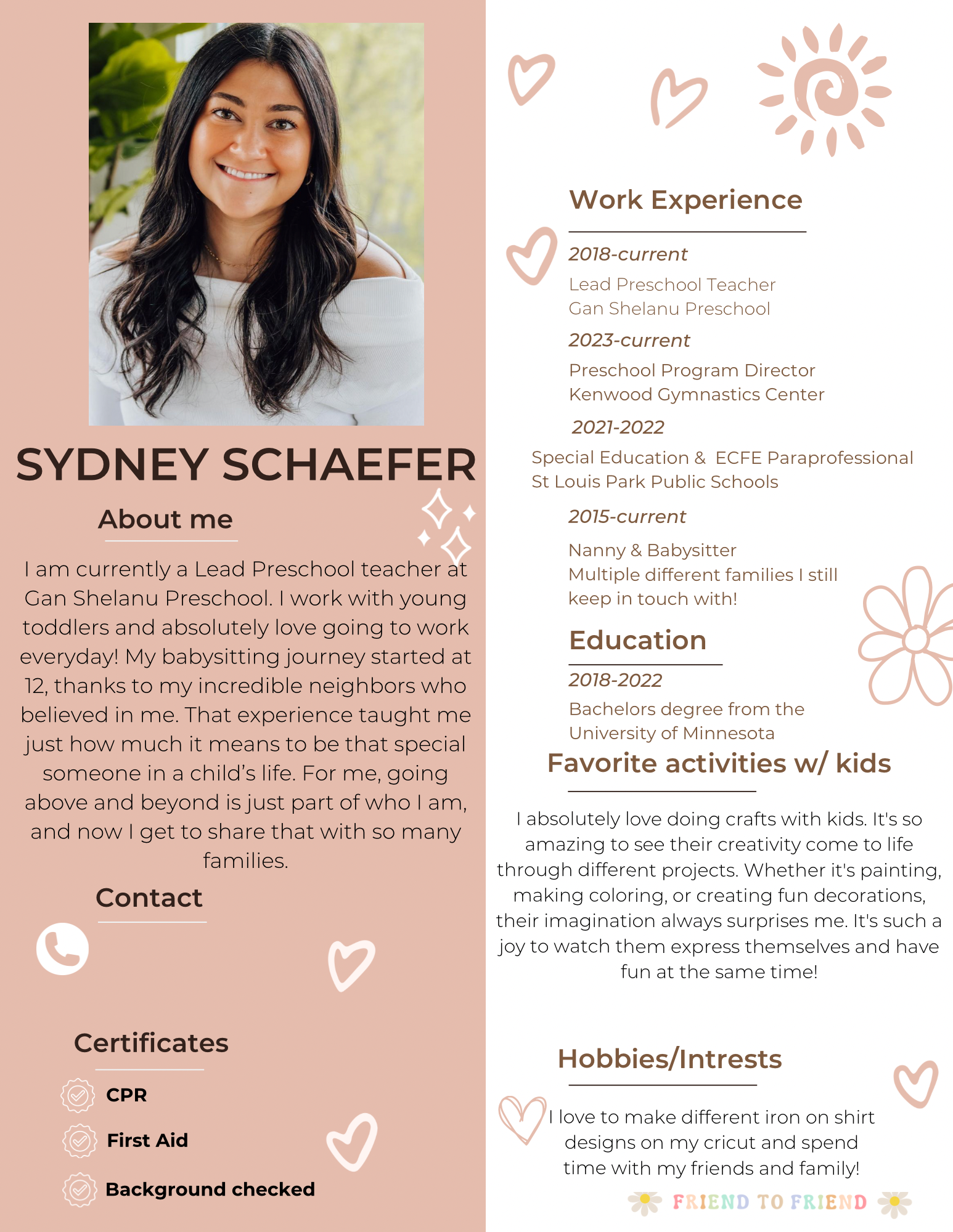 Now it's our turn! The Friend to Friend team will reach out to your perfect match. Once the babysitter is confirmed, we'll send over their profile for you to review (example below). This profile will include their experience, education, babysitting rate, and any relevant information. If you confirm the sitter is a good fit for you, we'll share their contact info, and you can take it from there!